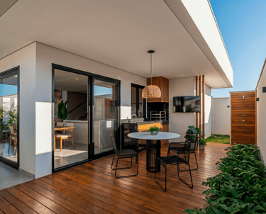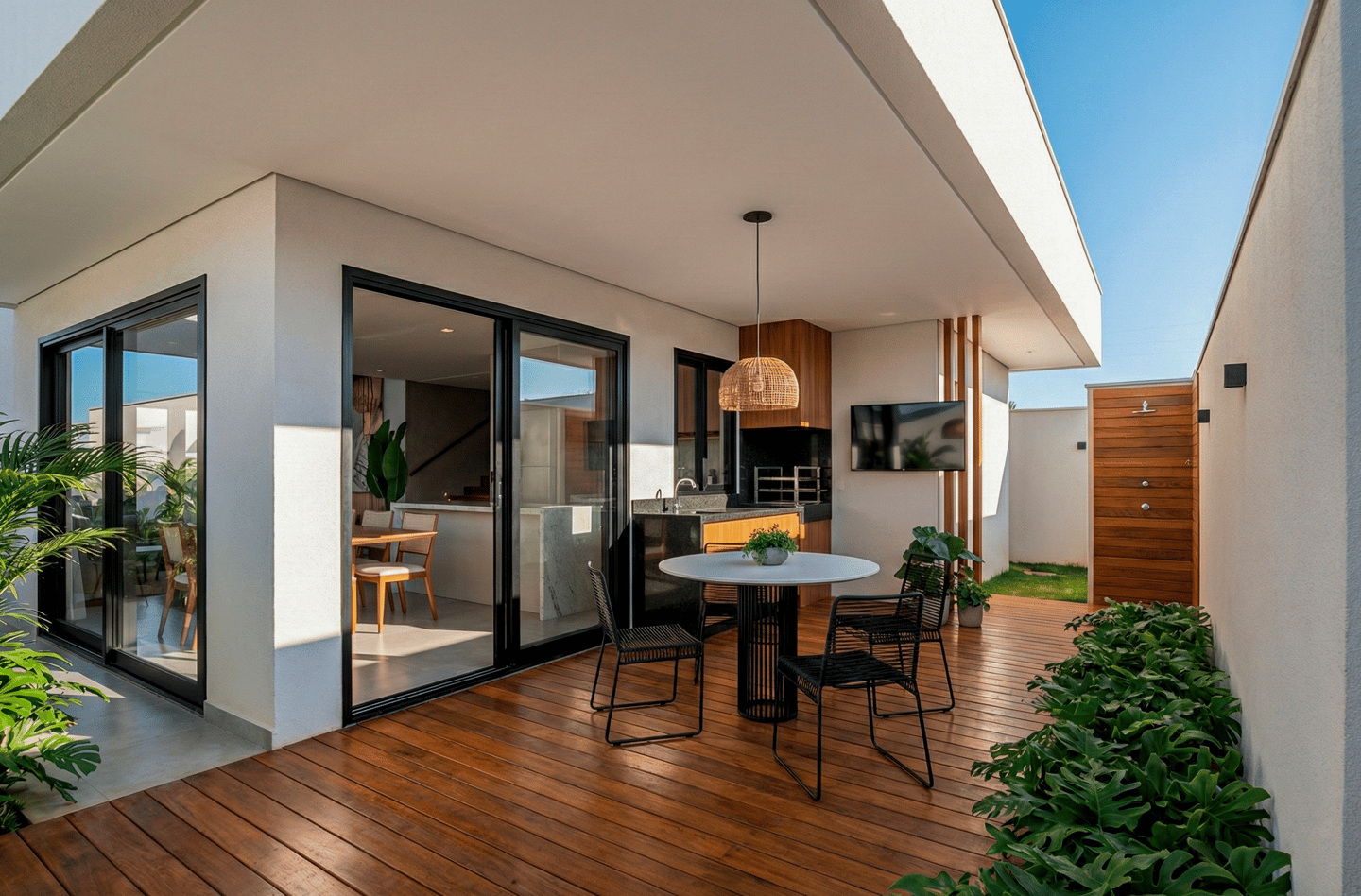 O aproveitamento do terreno de 200m² é notável na área de lazer compacta, porém completa. Um deck de madeira elevado setoriza o ambiente, criando um solário natural que abraça a área gourmet. Esta, equipada com churrasqueira e bancadas em pedra escura, convida a momentos de convívio intimista. A atenção aos detalhes percebe-se na escolha do mobiliário leve – como as cadeiras em corda náutica preta – e na ducha externa revestida em madeira, que mimetiza um spa particular.