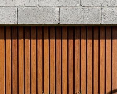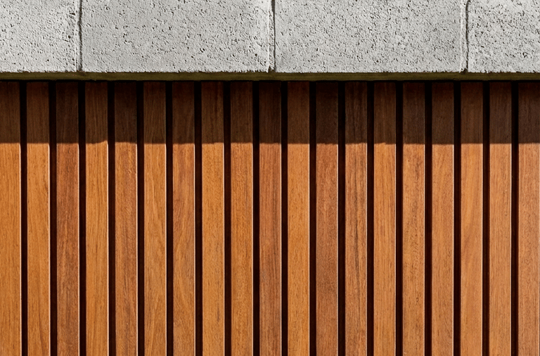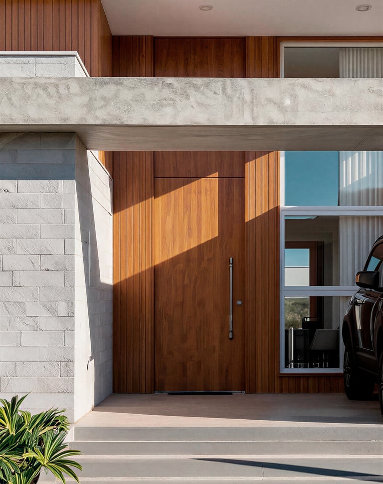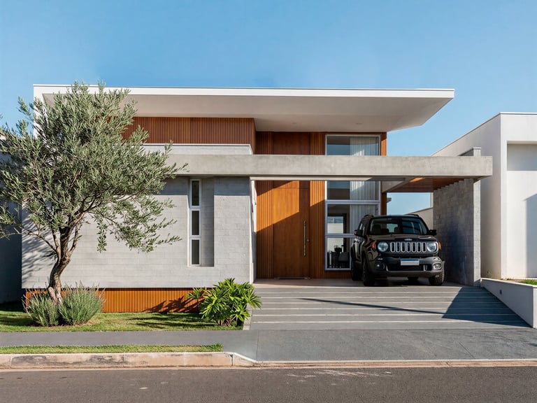 Concebida para um casal de meia-idade que buscava a praticidade de uma casa sem escadas, mas sem abrir mão da sofisticação visual, a arquitetura responde com um jogo de volumes e texturas que encanta à primeira vista. A fachada apresenta uma composição equilibrada entre o concreto aparente, tijolinhos em tons de cinza e a madeira ripada, que traz calor e marca a entrada principal. A cobertura plana, com linhas retas e puras, projeta-se suavemente sobre a garagem, criando uma sensação de leveza estrutural que desafia a robustez dos materiais. O paisagismo frontal, pontuado por uma oliveira escultural, suaviza a geometria e dá as boas-vindas com um toque orgânico.