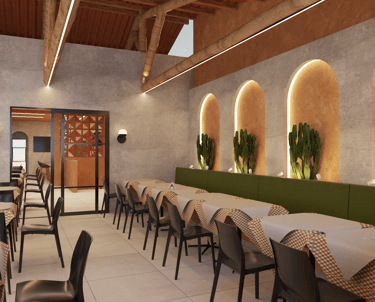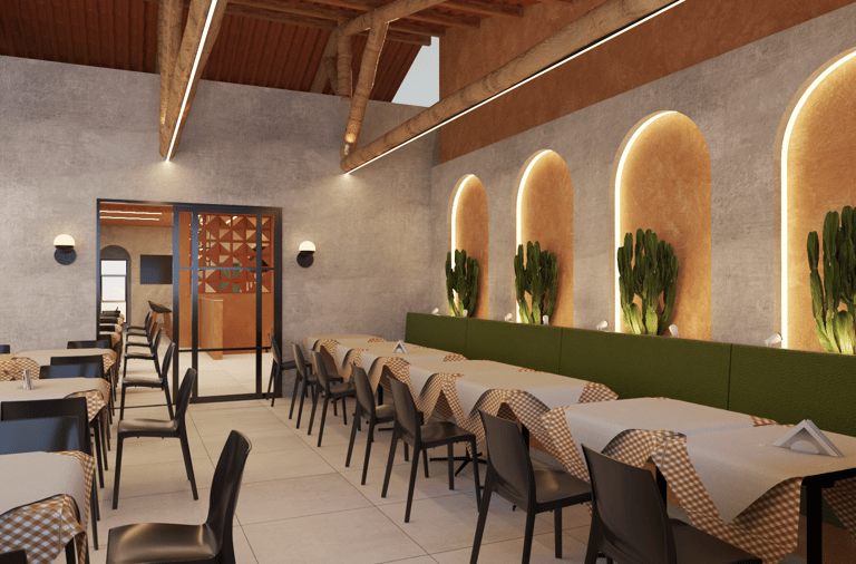 No nível superior, a presença da estrutura aparente em madeira e a cobertura inclinada introduzem um caráter mais rústico e afetivo, contrastando de maneira equilibrada com a base mais contemporânea. Essa dualidade — entre o moderno e o tradicional — é um dos pontos mais interessantes do projeto, pois traduz arquitetonicamente o conceito do negócio: um lugar atual, mas com raízes na tradição.